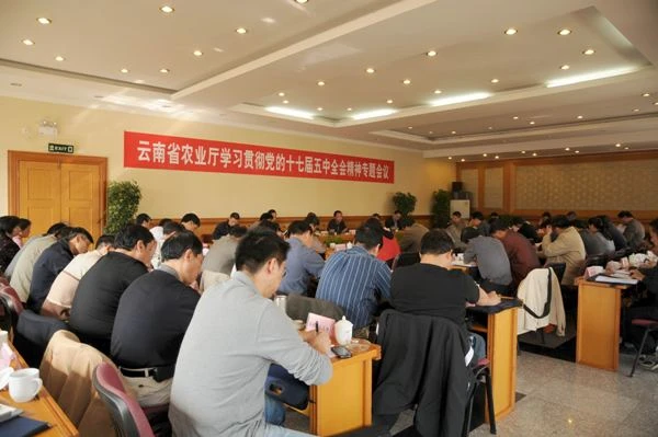云南省农业厅学习贯彻党的十七届五中全会精神专题会议于10月21日在昆明召开,会议由农业厅直属机关党委专职副书记张延斌主持,厅直属机关党委委员、厅机关各处室(包括离退休职工支部)、厅属各单位党组织负责人共60余人参加会议。