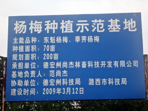 杨梅主产浙江省,1988传入云南省石屏县,近年来全省一些地方均有分布,德宏州已有零星种植,当前杨梅在德宏市场价格不低于20元/kg,且供不应求,发展前景很好。德宏州尚杰林畜科技开发有限责任公司自2009年初成立后,首先主导杨梅产业的科技示范种植。