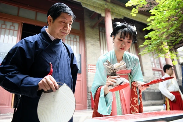 4月14日,汉服爱好者在西安碑林博物馆上巳节雅集活动上体验拓印。新华社记者 李一博 摄