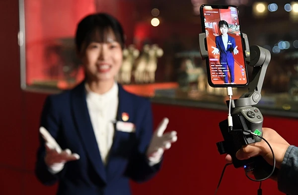 2020年4月30日,在北京汽车博物馆,讲解员曾红娟通过网络直播平台为观众介绍馆内的藏品车。新华社记者 任超 摄
