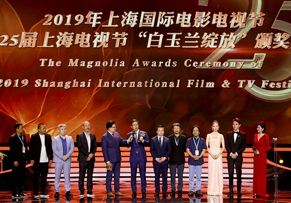 2019年6月14日,第25届上海电视节落下帷幕,获得“最佳中国电视剧”的《大江大河》主创上台领奖。新华社记者 刘颖 摄