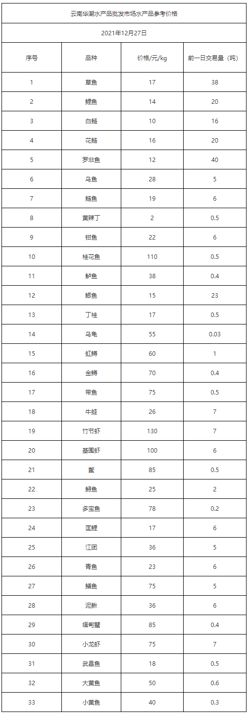 云南华潮水产品批发市场水产品2021年12月27日参考价格