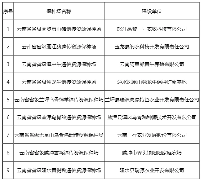 根据《中华人民共和国畜牧法》和《云南省省级畜禽遗传资源保种场保护区和基因库管理办法》规定,经逐级申报、实地审验、专家评审及公示,确定9个第二批省级畜禽遗传资源保种场(名单见附件)。