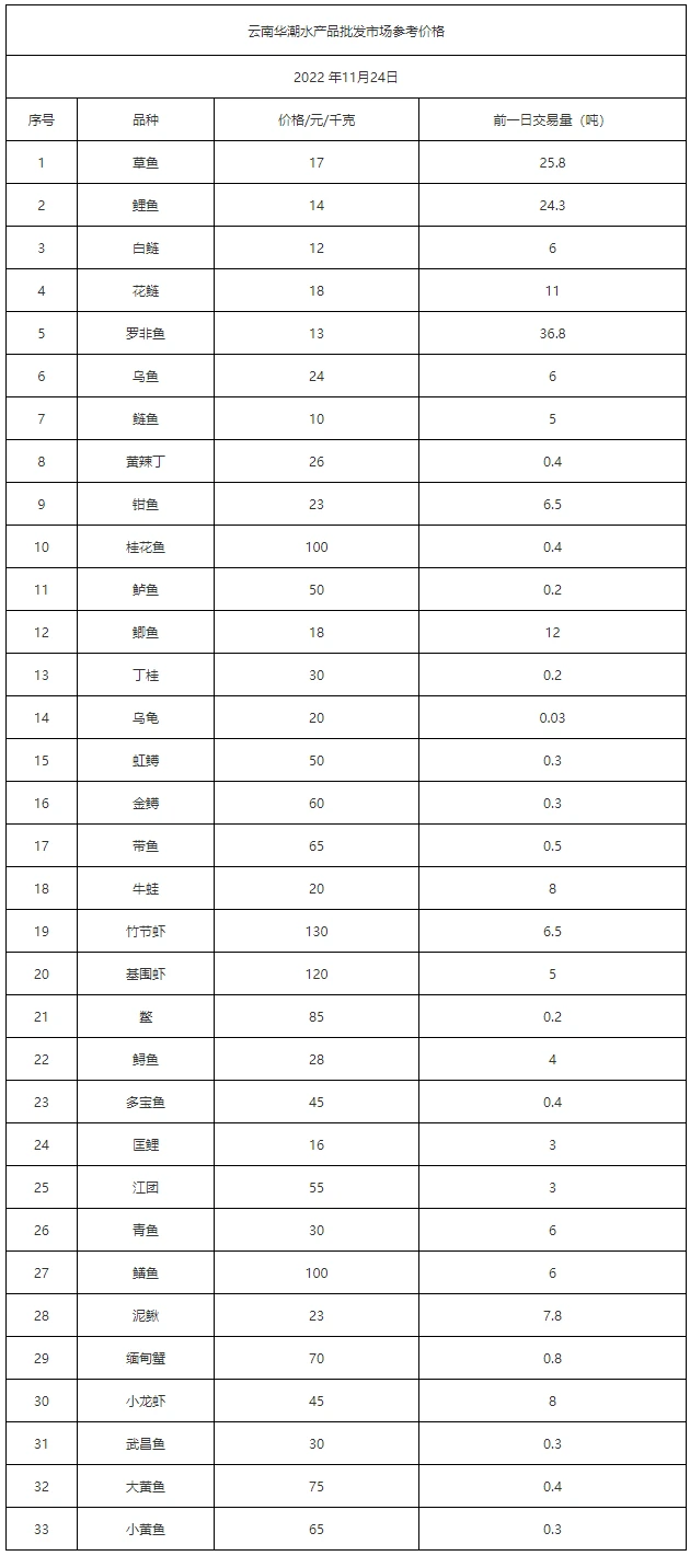 云南华潮水产品批发市场2022年11月24日参考价格