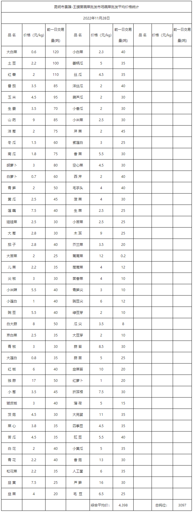 昆明市景臻-王旗营蔬菜批发市场2022年11月28日蔬菜批发平均价格统计