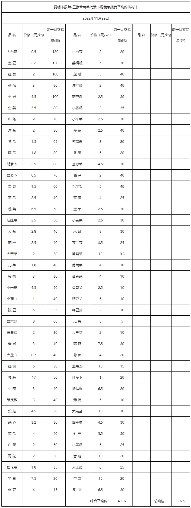 昆明市景臻-王旗营蔬菜批发市场2022年11月29日蔬菜批发平均价格统计