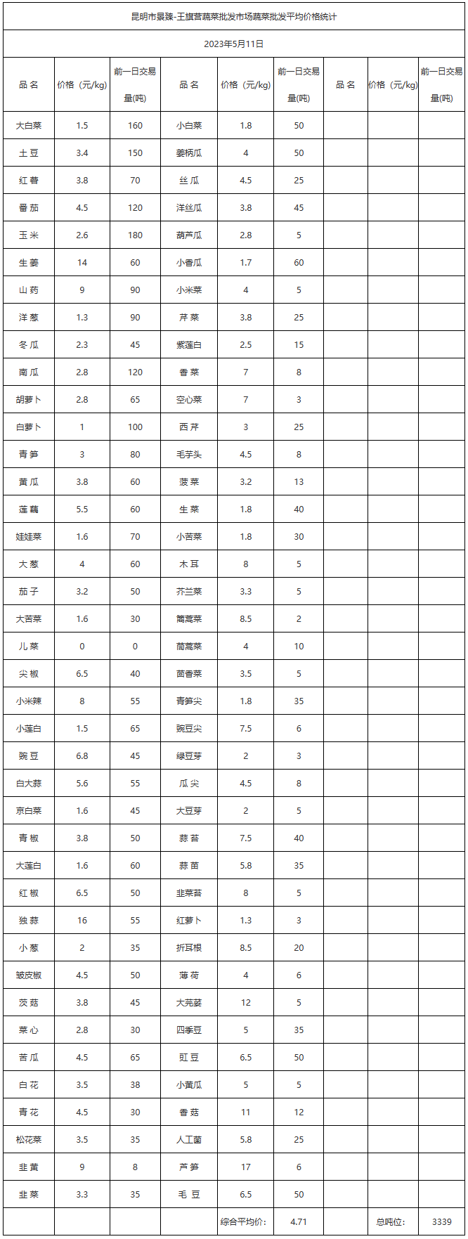 昆明市景臻-王旗营蔬菜批发市场2023年5月11日蔬菜批发平均价格统计
