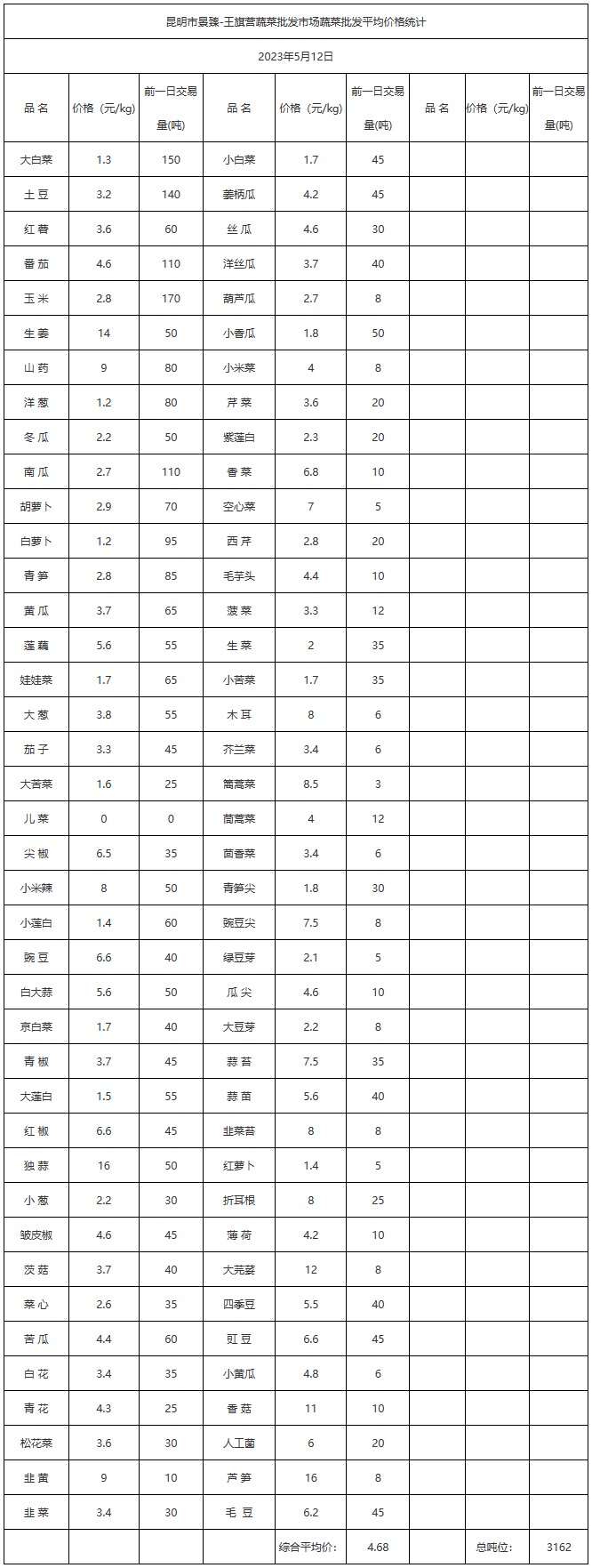 昆明市景臻-王旗营蔬菜批发市场2023年5月12日蔬菜批发平均价格统计