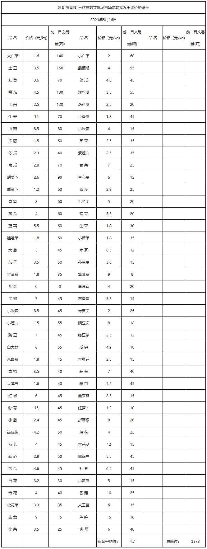 昆明市景臻-王旗营蔬菜批发市场2023年5月16日蔬菜批发平均价格统计