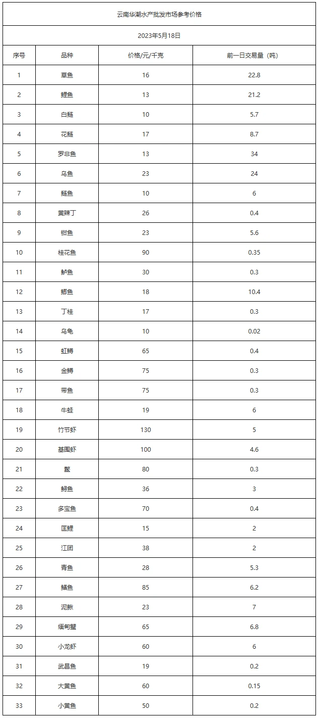 云南华潮水产批发市场2023年5月18日参考价格