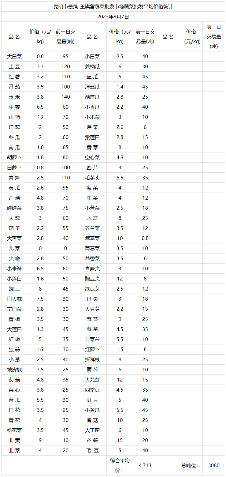 昆明市景臻-王旗营蔬菜批发市场2023年9月7日蔬菜批发平均价格统计