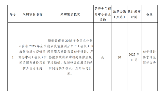 为便于供应商及时了解政府采购信息,根据《财政部关于开展政府采购意向公开工作的通知》(财库〔2020〕10号)等有关规定,现将云南省植保植检站2025年10月(至)2025年11月政府采购意向公开如下: