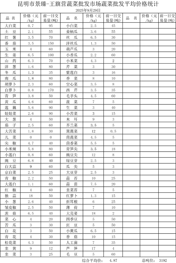 昆明市景臻-王旗营蔬菜批发市场2025年9月29日蔬菜批发平均价格统计