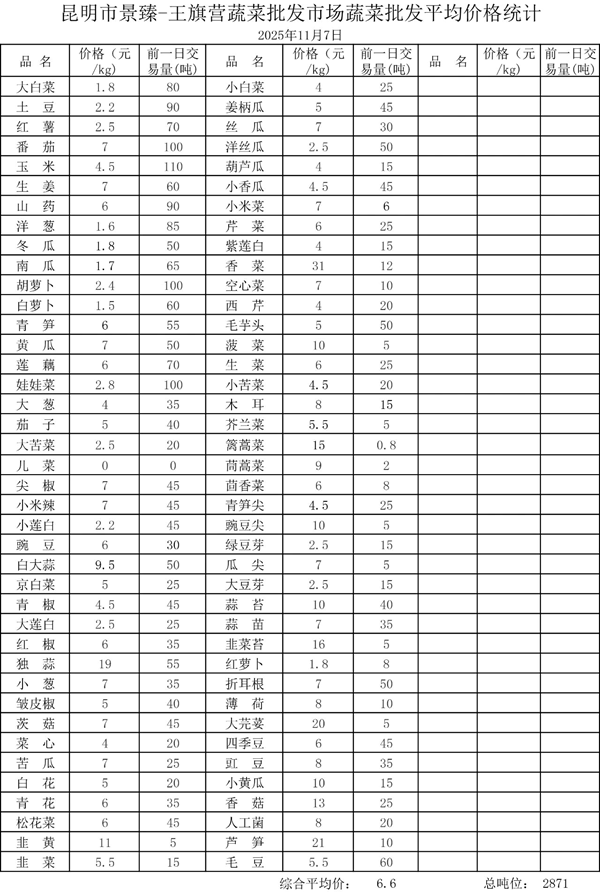 昆明市景臻-王旗营蔬菜批发市场2025年11月7日蔬菜批发平均价格统计