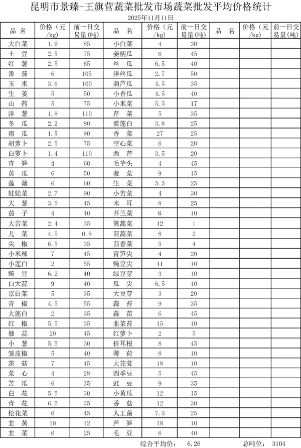 昆明市景臻-王旗营蔬菜批发市场2025年11月11日蔬菜批发平均价格统计