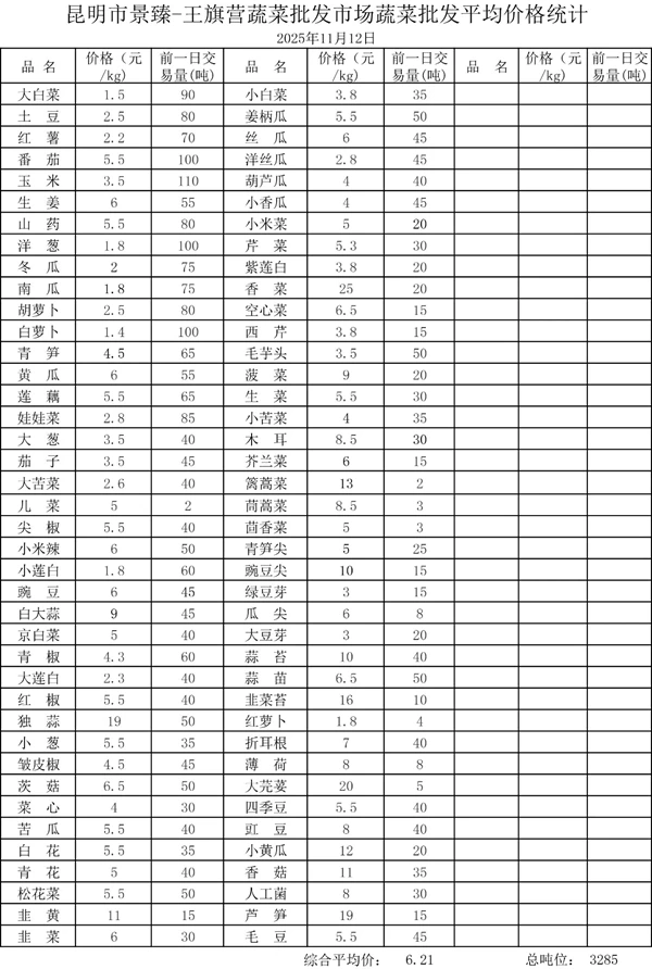 昆明市景臻-王旗营蔬菜批发市场2025年11月12日蔬菜批发平均价格统计