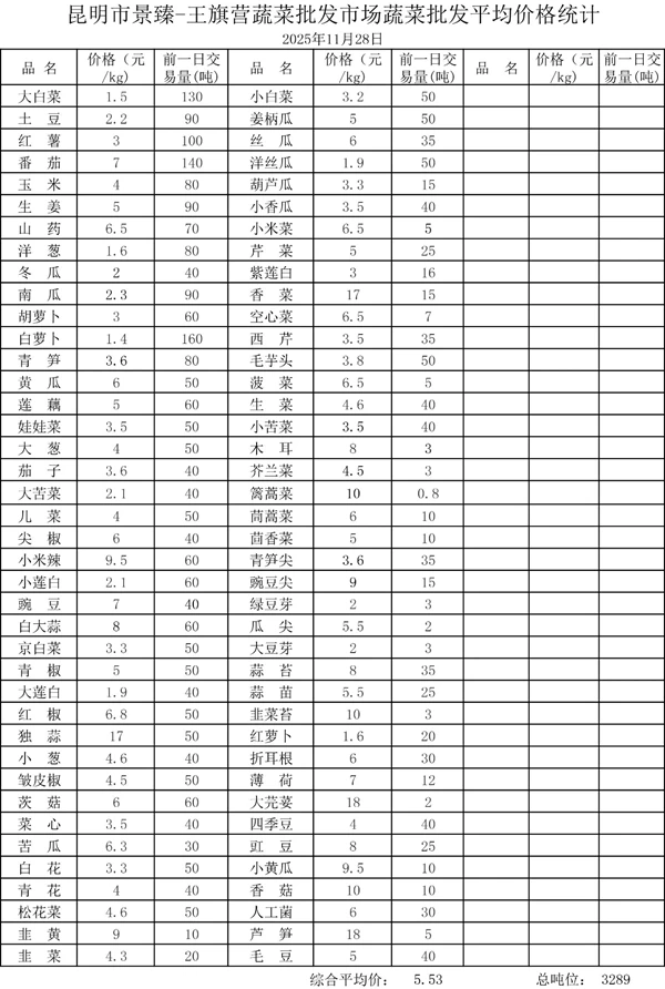 昆明市景臻-王旗营蔬菜批发市场2025年11月28日蔬菜批发平均价格统计