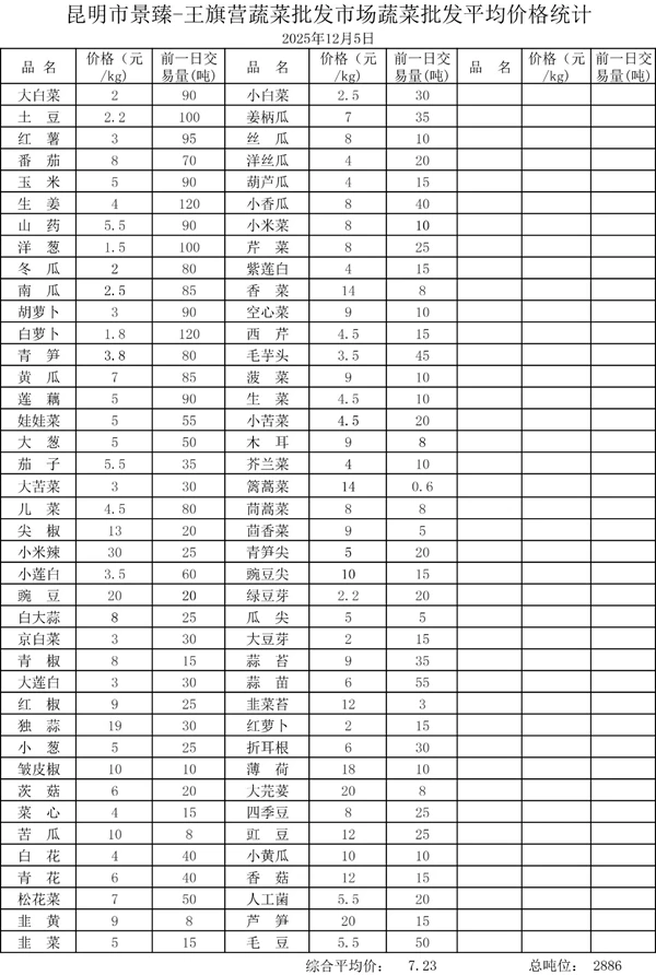 昆明市景臻-王旗营蔬菜批发市场2025年12月5日蔬菜批发平均价格统计