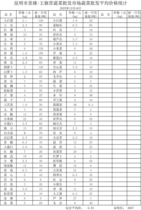 昆明市景臻-王旗营蔬菜批发市场2025年12月16日蔬菜批发平均价格统计