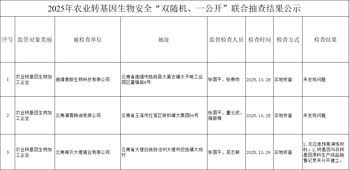 2025年农业转基因生物安全“双随机、一公开”联合抽查结果公示