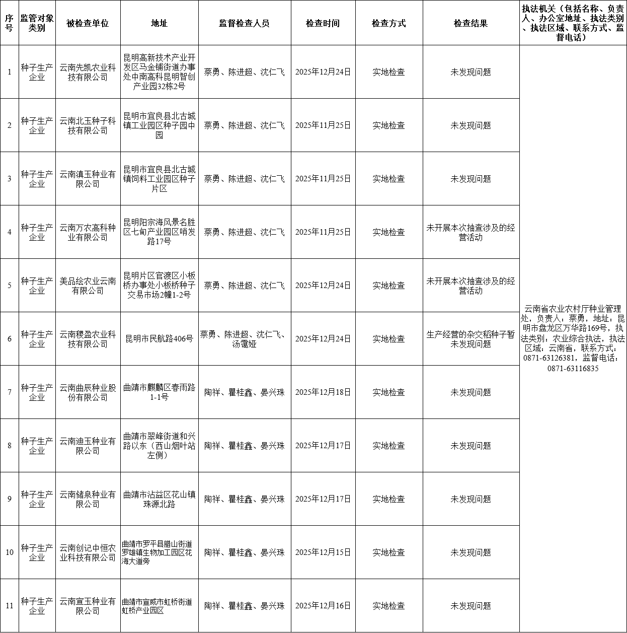 云南省农业农村厅2025年种子监督检查“双随机、一公开”抽查结果公示