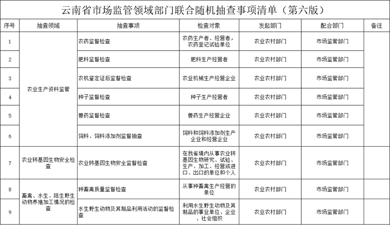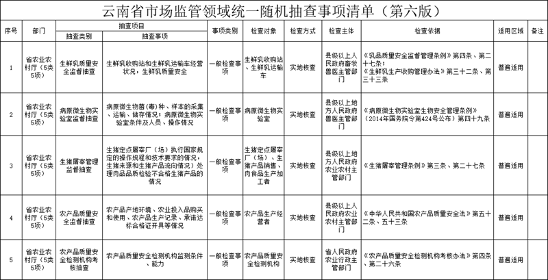 云南省农业农村厅市场监管领域统一随机抽查、部门联合随机抽查事项