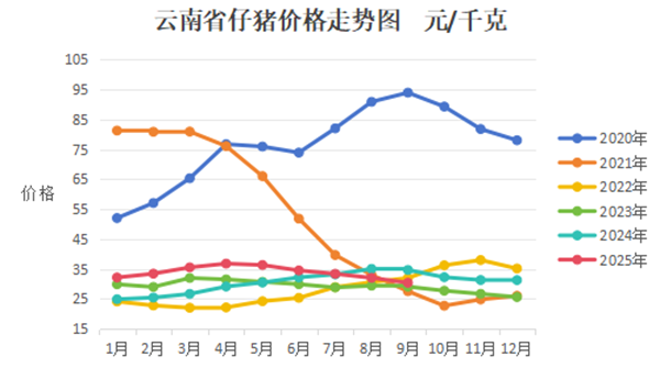 1.仔猪30.37元/千克,同比下跌12.35%,环比下跌5.09%,每千克比全国30.06元高0.31元,高1.03%。价格最低的是楚雄市,20.48元/千克,最高的是富宁县,40.4元/千克。