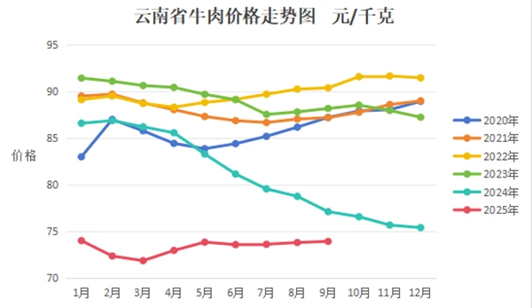 2.牛肉73.92元/千克,环比上涨0.16%,同比下跌4.14%,每千克比全国均价70.9元高3.02元,高4.26%。