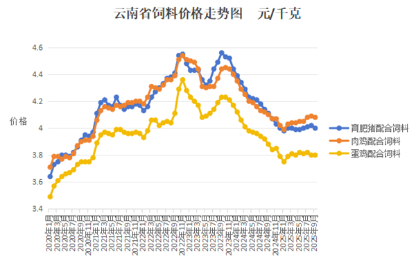 据养殖场直联直报系统9月份对云南省20个部级集贸市场和采集点的监测,监测的18个指标,仔猪、生猪、猪肉、商品代蛋雏鸡、饲料原料、育肥猪配合饲料和肉鸡配合饲料价格环比下跌,生鲜乳、蛋鸡配合饲料环比持平,其余7个指标环比上涨。活牛价格高于全国均价,其余指标均低于全国均价,其中,仔猪价格连续18个月低于全国均价后,于9月高于全国均价,此外,小麦麸连续12个月、肉鸡配合饲料连续3个月、蛋鸡配合饲料连续40个月为全国最高价格。