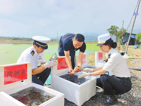 图为海关关员在勐海县养殖场对出口阿联酋的活鱼开展属地查检。通讯员 李夕妹 摄