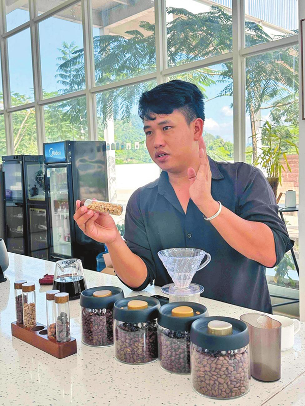 普洱野鸭塘河谷庄园负责人李明春为游客介绍云南咖啡豆。