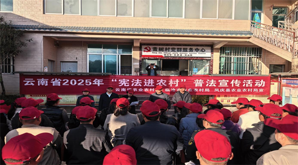 12月4日,在第十二个国家宪法日到来之际,省农业农村厅、临沧市农业农村局、凤庆县农业农村局、凤山镇人民政府联合在青树村举行云南省2025年“宪法进农村”普法宣传活动。活动紧扣“学习宣传贯彻习近平法治思想,推动宪法深入人心”主题,按照中央、省“宪法宣传周”部署要求,将维护宪法权威、弘扬宪法精神、遵循宪法规定重要理念融入“七个一”活动。省、市、县、乡、村400余人参加了宣传活动。