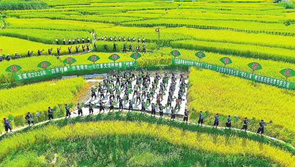 此外,“喍奢扎”节打谷子比赛、梯田拔河等活动吸引众多游客和群众参与。打谷子比赛中,哈尼族群众手持稻穗奋力击打谷桶,金黄的稻粒纷飞,展现农耕技艺的传承,体验农趣和收获的喜悦。(记者:杨茜 通讯员:田双燕 周馗)