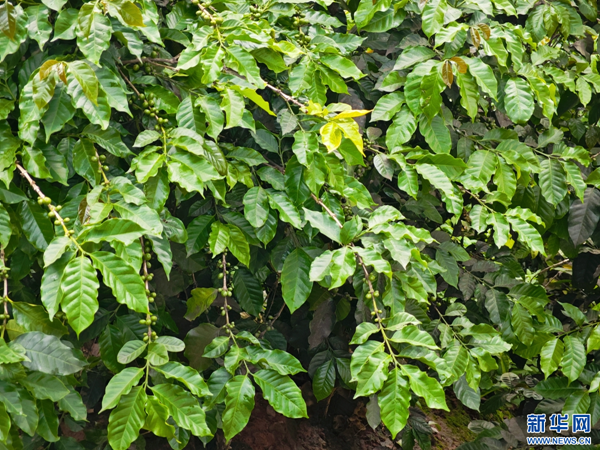 普胜村山坡上的咖啡树挂满了绿色的果实,长势喜人(7月8日摄)。新华网发(杨亦麟 摄)