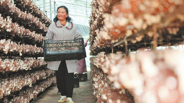 杨雪梅正在搬运香菇。通讯员 段茸茸 摄