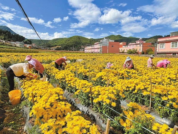 连日来,玉溪市易门县小街乡27亩金丝皇菊竞相盛放,一垄垄花海连绵成片,铺就一条群众增收、集体经济壮大的“黄金路”。