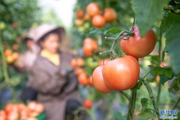 工人们采摘成熟的西红柿(11月6日摄)。新华网发(熊平祥 摄)