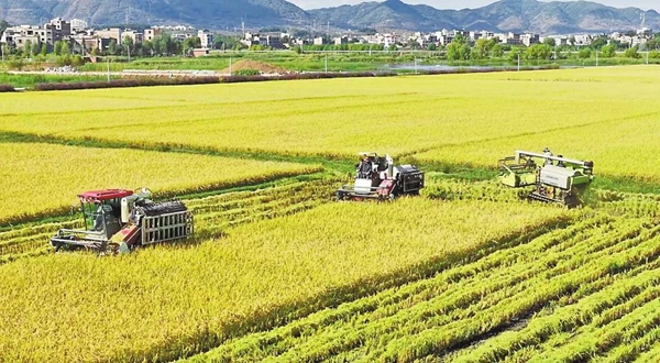 近日,昭通市鲁甸县水稻迎来丰收,当地农户抢抓晴好天气进行收割,确保秋粮颗粒归仓。在砚池街道水稻连片种植区,多台收割机开足马力、来回穿梭,大幅提升了收割效率。