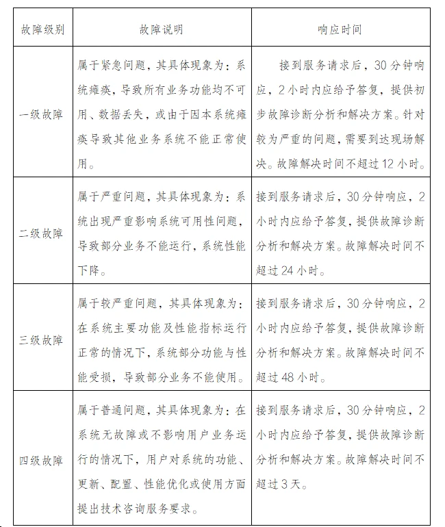 7.对事件、问题、故障、明确的分级策略,并与服务窗口时间、响应时间等指标相匹配;
