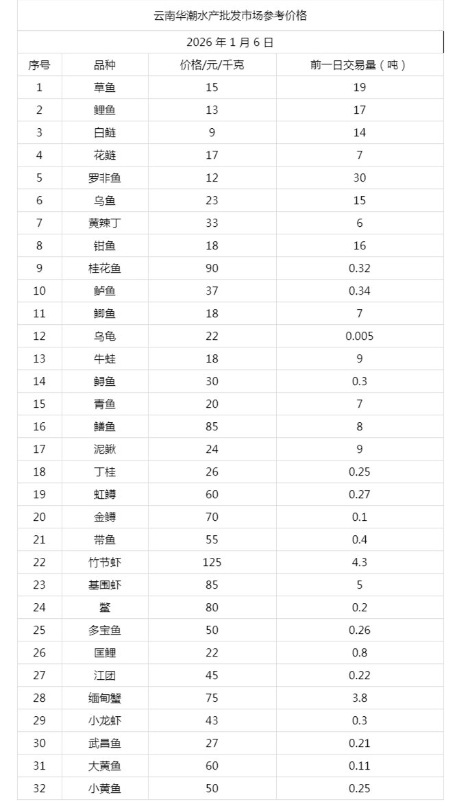 云南华潮水产批发市场2026年1月6日参考价格