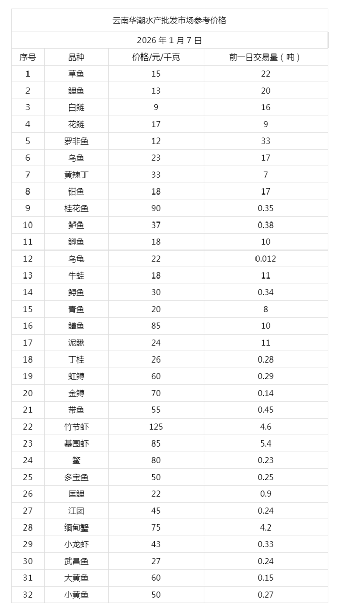 云南华潮水产批发市场2026年1月7日参考价格
