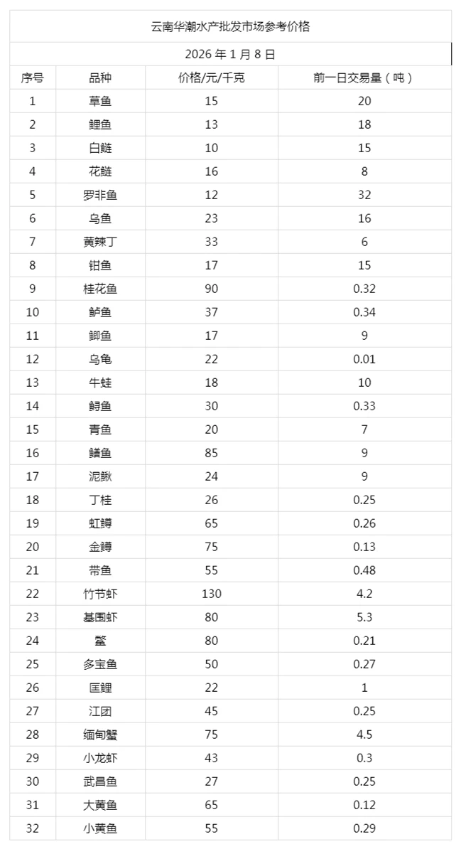 云南华潮水产批发市场2026年1月8日参考价格