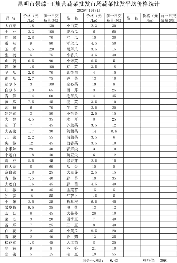 昆明市景臻-王旗营蔬菜批发市场2026年1月9日蔬菜批发平均价格统计