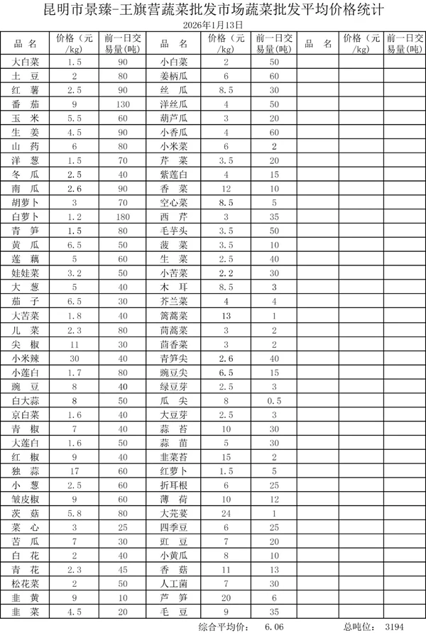 昆明市景臻-王旗营蔬菜批发市场2026年1月13日蔬菜批发平均价格统计