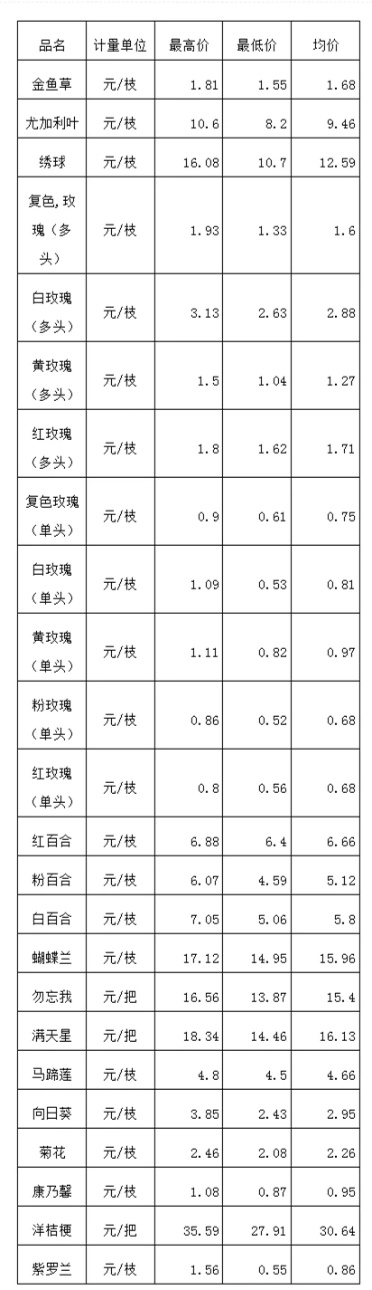 云南昆明斗南花卉市场2026年1月14日花卉价格信息