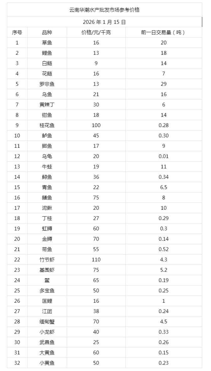 云南华潮水产批发市场2026年1月15日参考价格