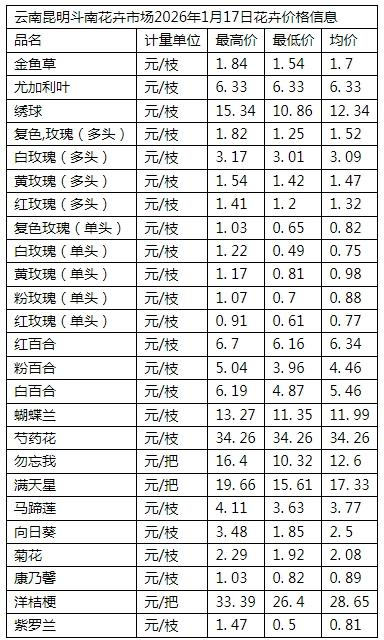 云南昆明斗南花卉市场2026年1月17日花卉价格信息