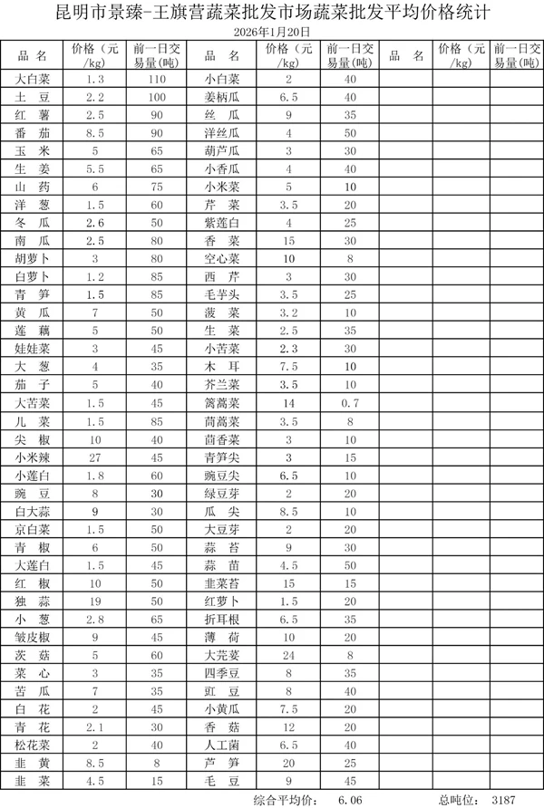 昆明市景臻-王旗营蔬菜批发市场2026年1月20日蔬菜批发平均价格统计