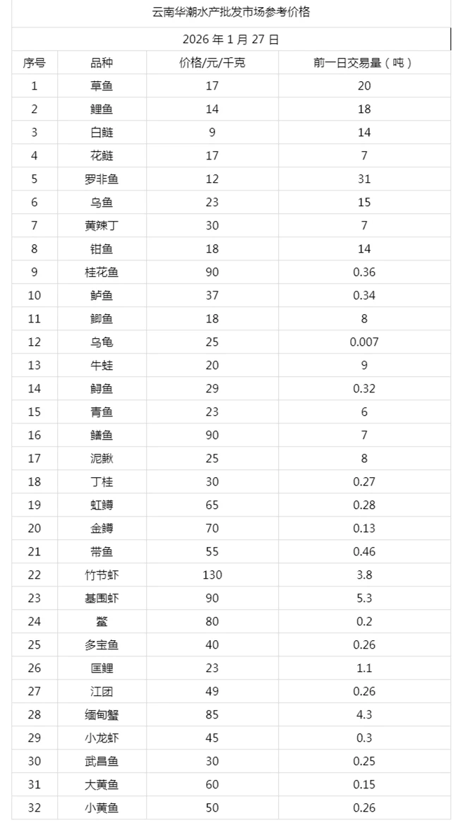 云南华潮水产批发市场2026年1月27日参考价格
