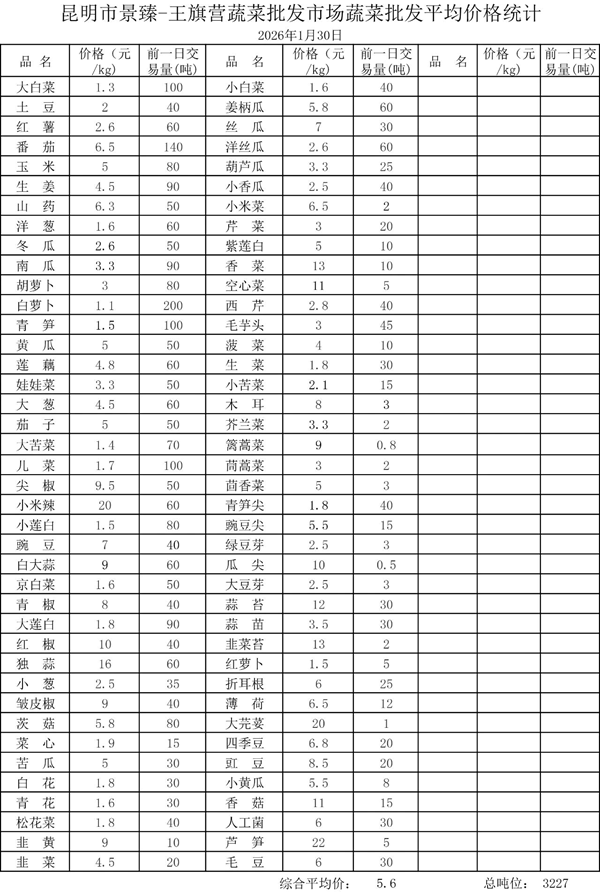 昆明市景臻-王旗营蔬菜批发市场2026年1月30日蔬菜批发平均价格统计